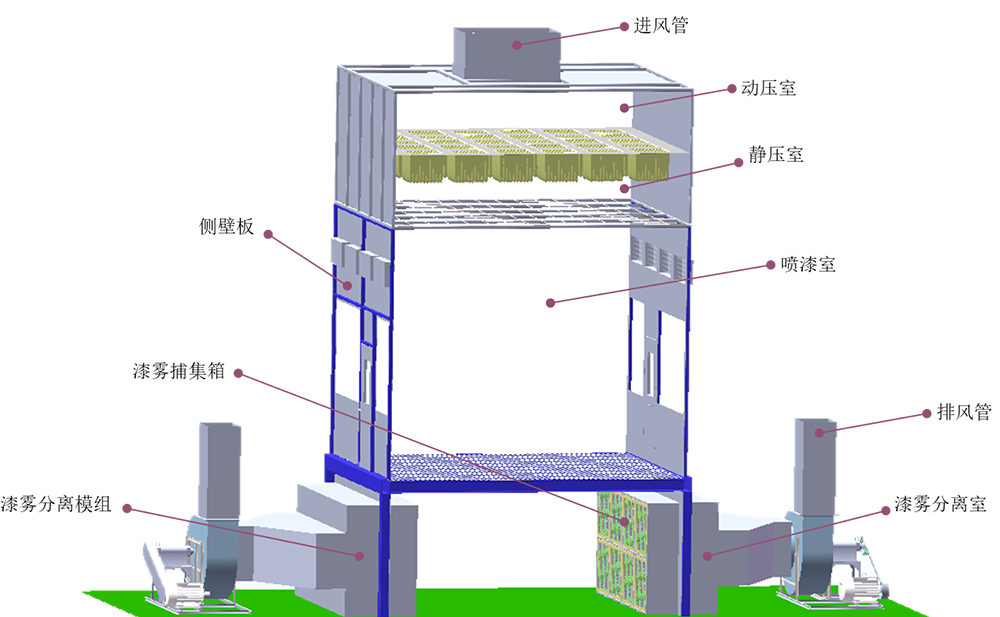 雙面?zhèn)任墒絿娖崾乙来伟ㄟM風(fēng)管、動壓室和靜壓式、噴漆作業(yè)室、漆霧捕集分離室、排風(fēng)管、排風(fēng)機等。
