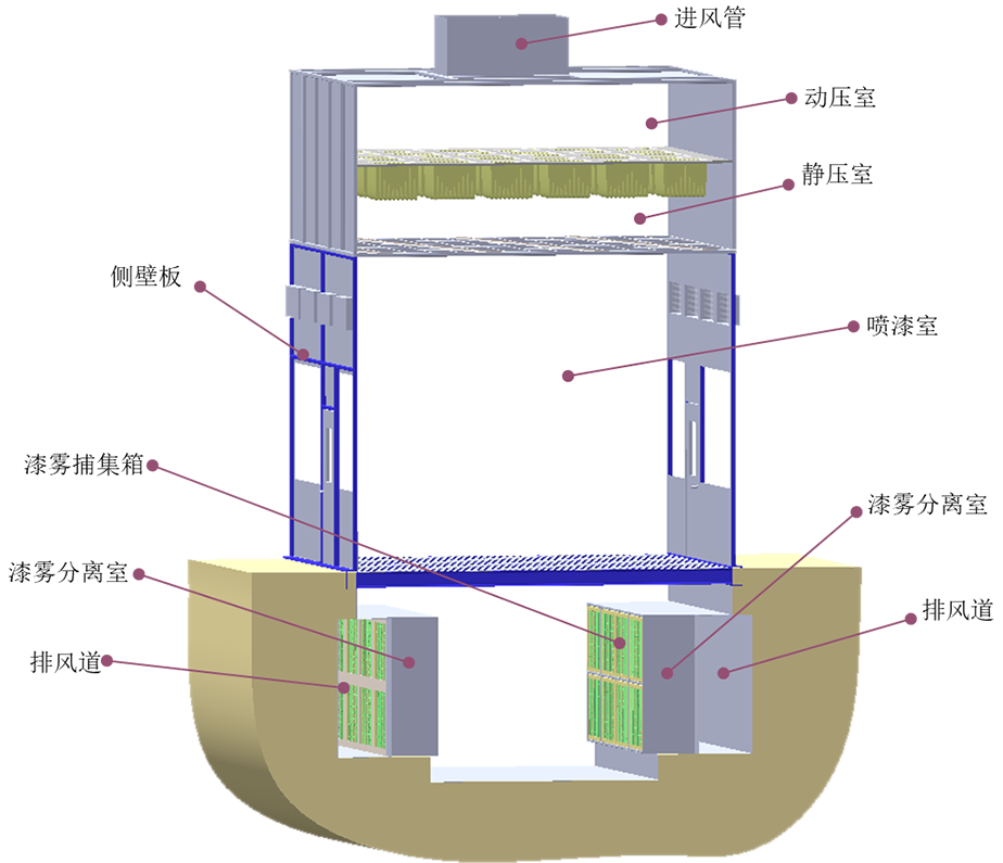 雙面?zhèn)任墒絿娖崾乙来伟ㄟM(jìn)風(fēng)管、動壓室和靜壓式、噴漆作業(yè)室、漆霧捕集分離室、排風(fēng)管、排風(fēng)機(jī)等。